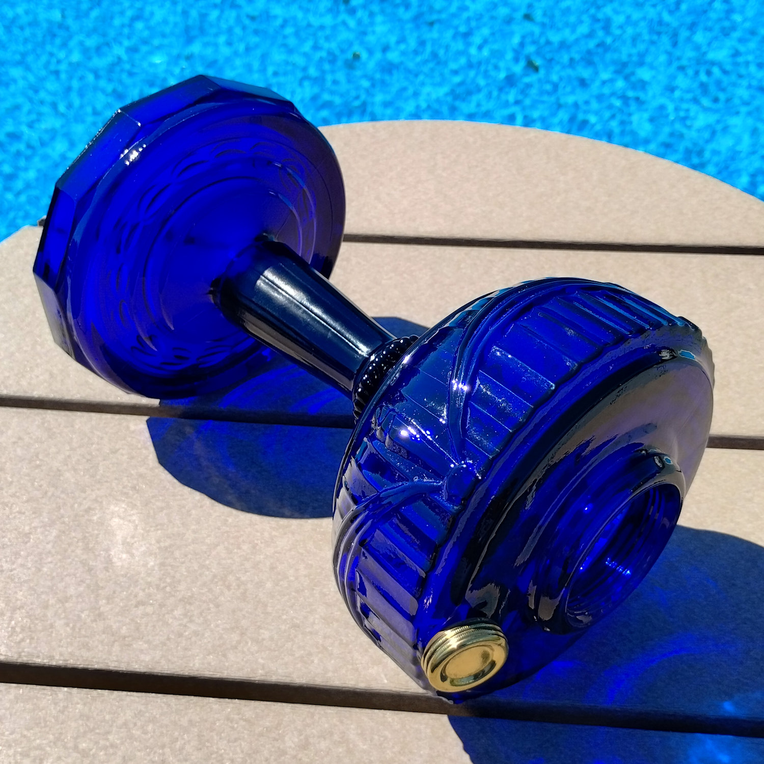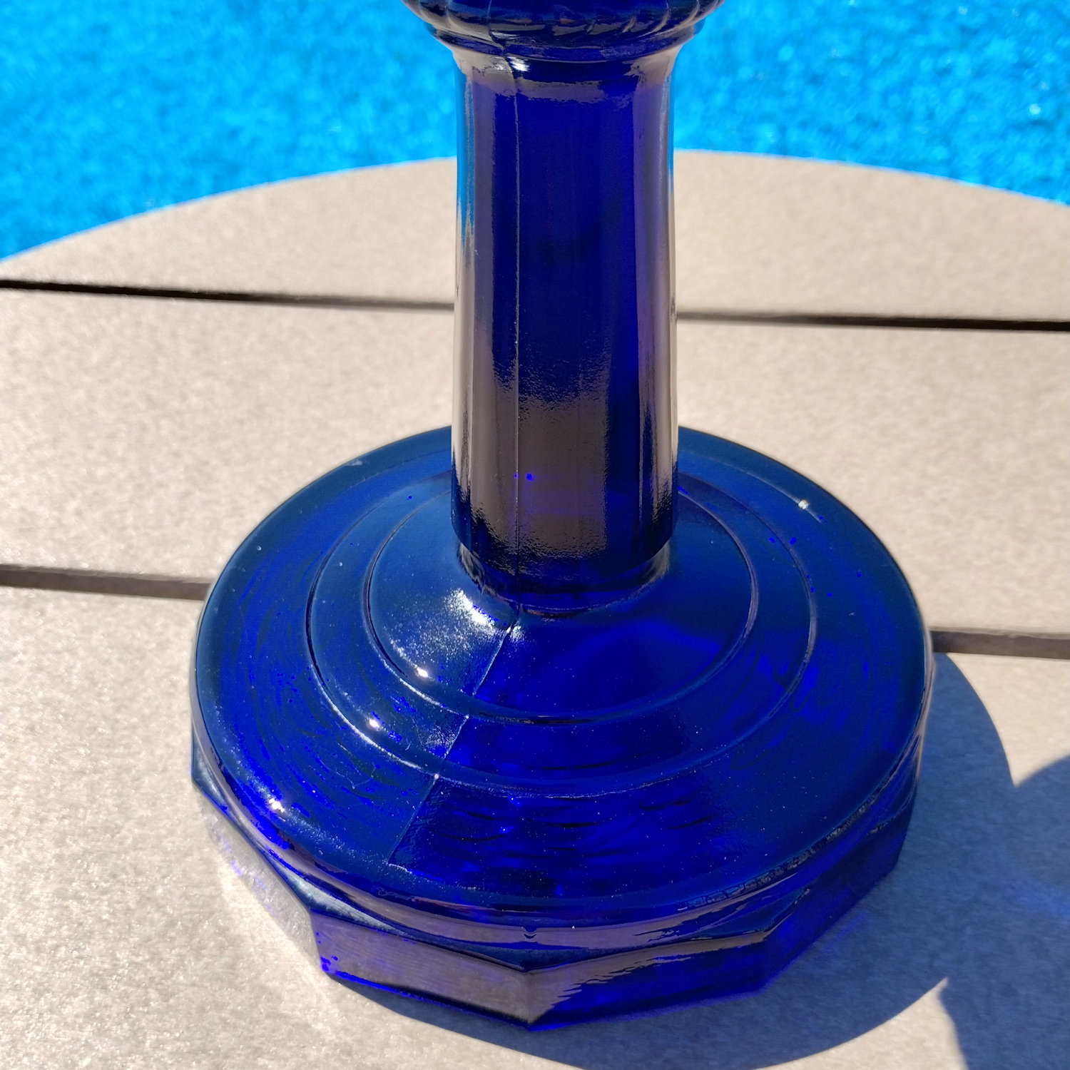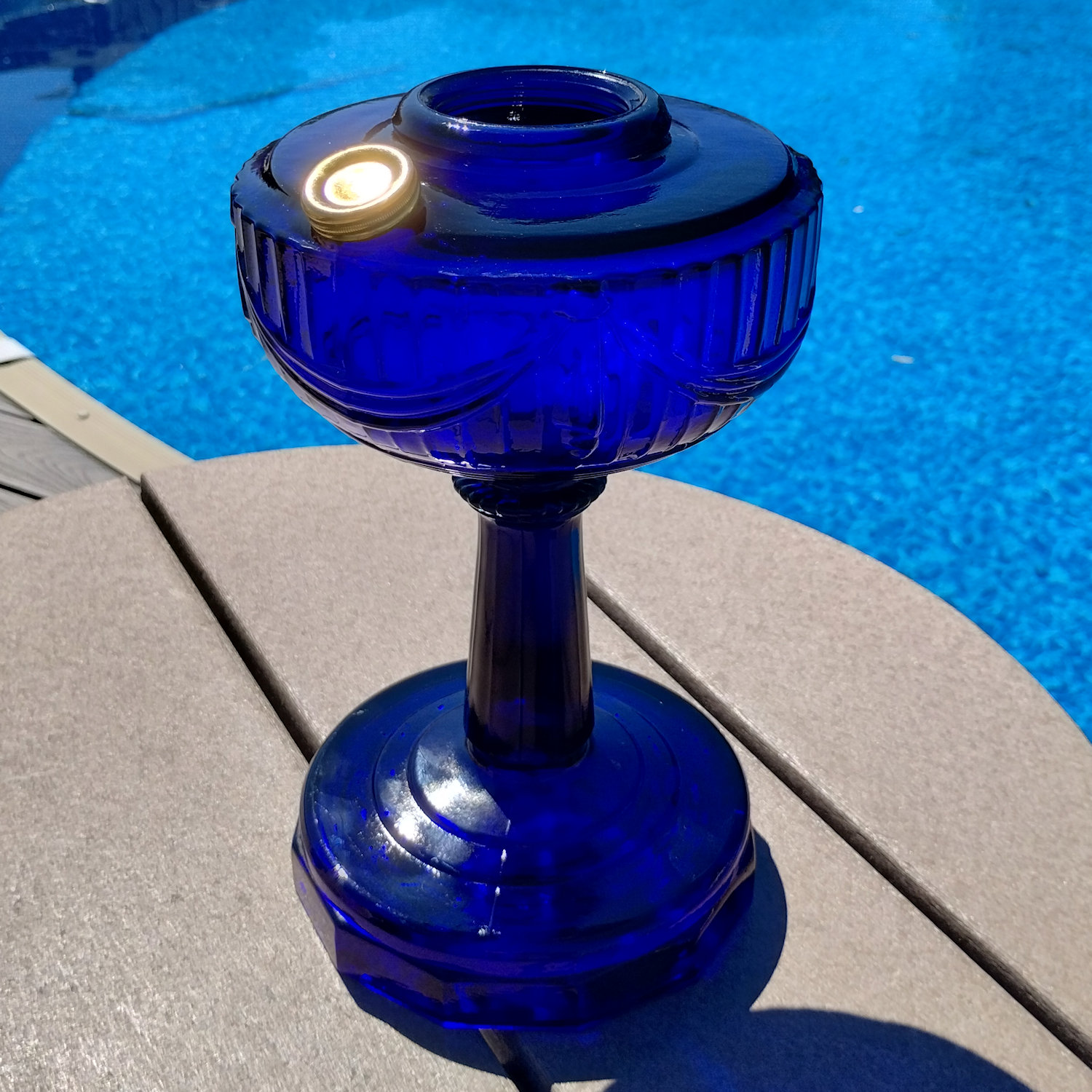 Aladdin Lamp Cobalt Blue Tall Lincoln Drape Plain Foot. Circa 1940-1949. This is an Old Original One-Piece Lamp – This is not a reproduction. Although the images in this listing were taken outdoors on a cloudless day with very strong sunlight, this lamp has very strong dark cobalt color in indoor lighting.