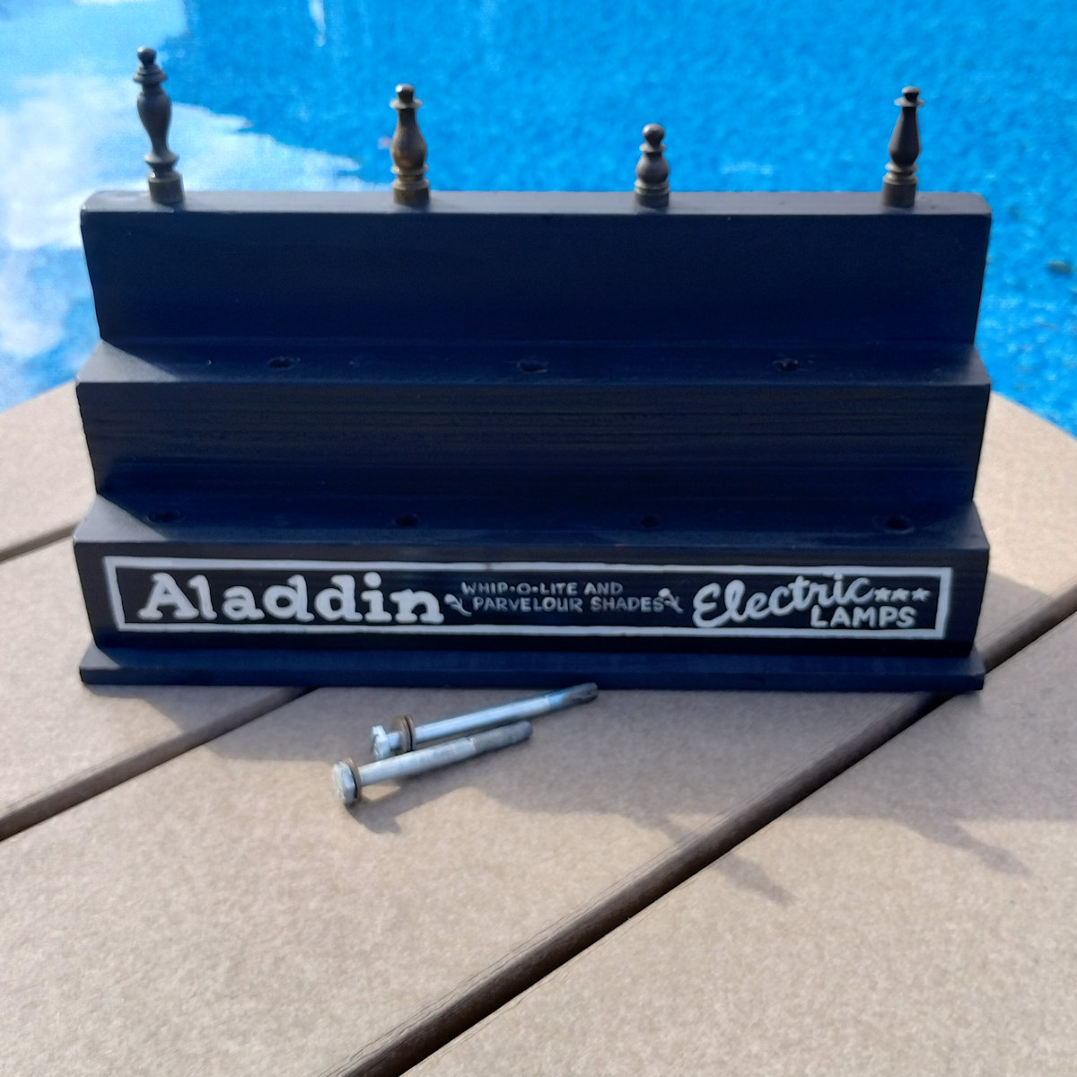 Aladdin Lamp Lamp Finial Stand. Handmade and hand-painted by a long time member of the Aladdin Knights Club. This finial stand is made of wood with bolts used to hold the finials in place.