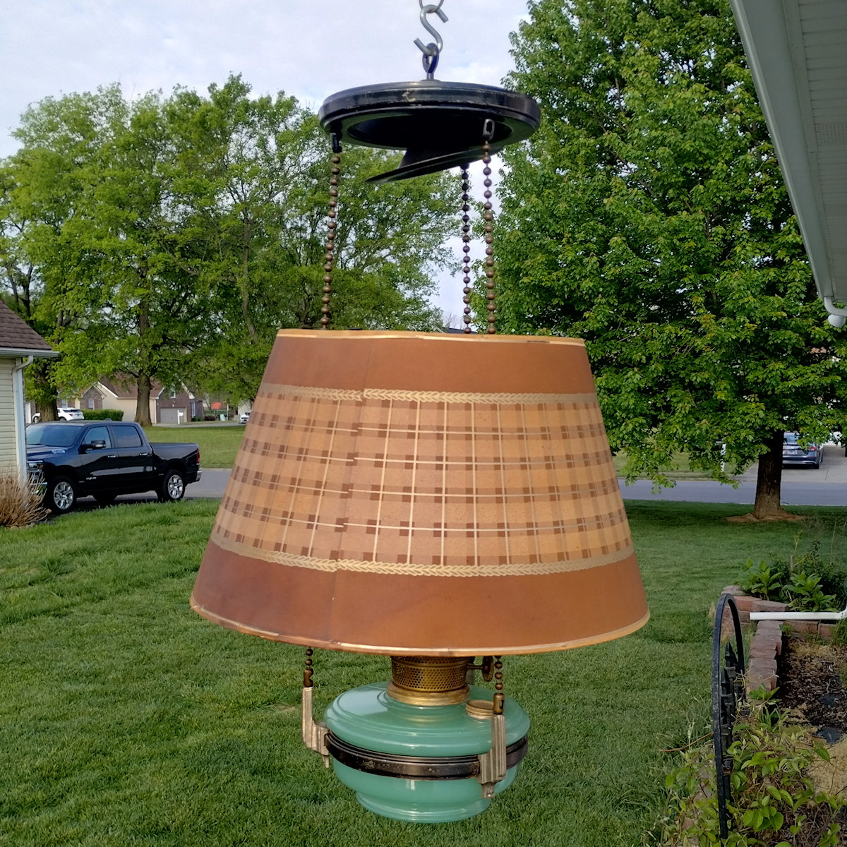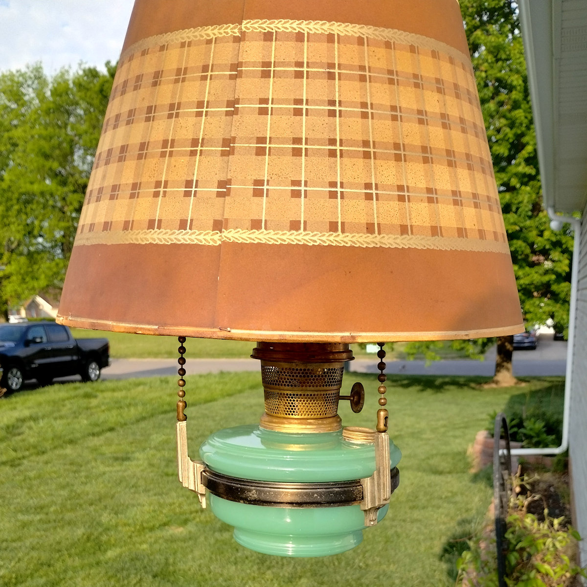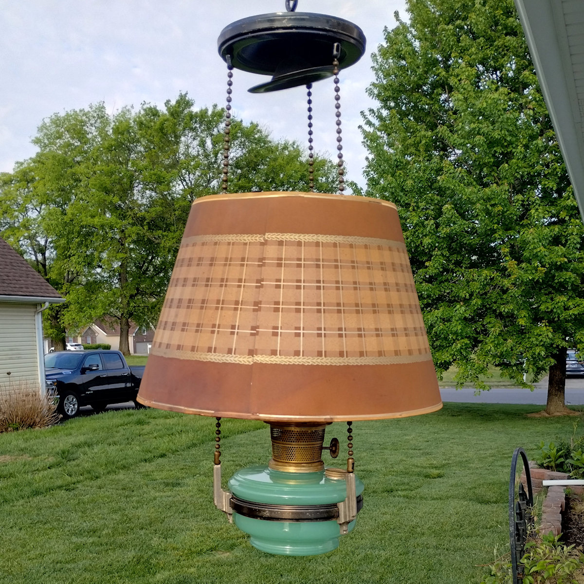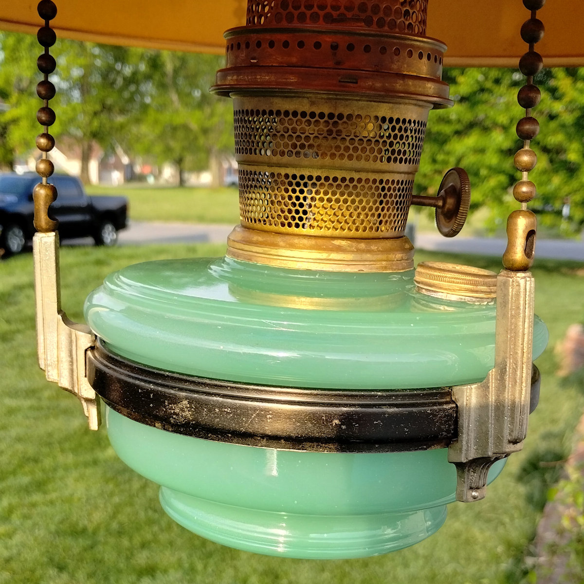 Aladdin Lamp Inside Chain Hanging Lamp with Parchement Shade. As you may know, the inside chaing hanging lamps can be a challenge to find. This lamp has the Green moonstone fount, with no chips or cracks. The burner is the correct Model B. This burner is complete except for a wick. The flame spreader is an old original with small dent in the perforated section. The outer wick tube has the ever present “B wick tube stress crack) See images. The bottom of the burner has hole drilled in it, but that can be easily corrected replacing the bottom center plate. The frame appears to have had some repainting done. The whipolite shade is an old original as is the heat bell (smoke bell)