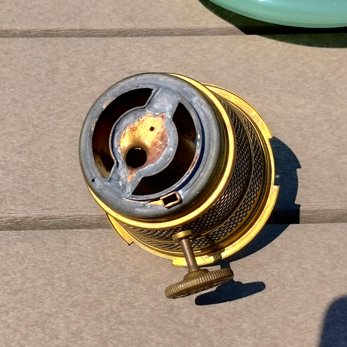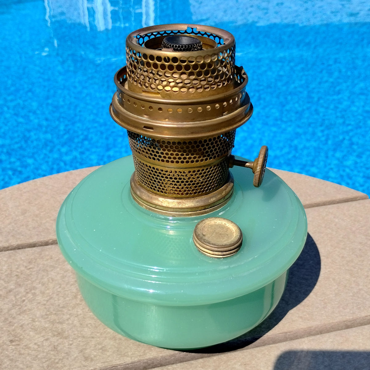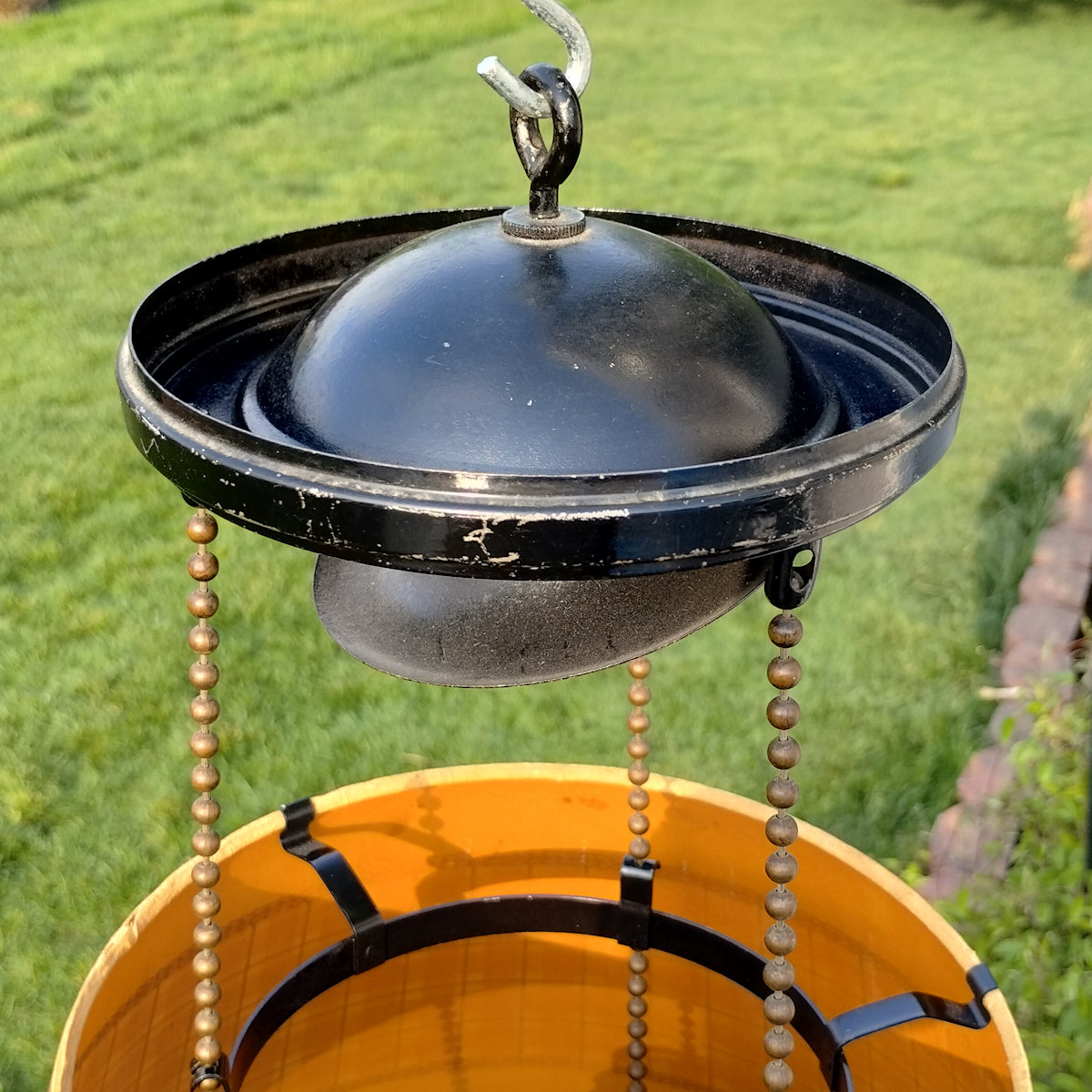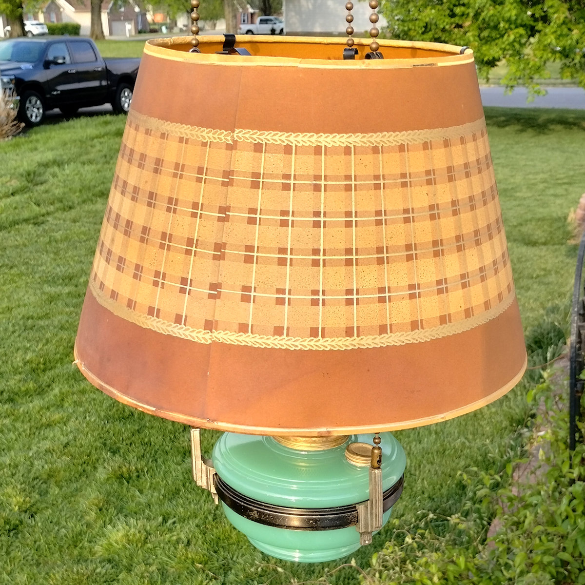 Aladdin Lamp Inside Chain Hanging Lamp with Parchement Shade. As you may know, the inside chaing hanging lamps can be a challenge to find. This lamp has the Green moonstone fount, with no chips or cracks. The burner is the correct Model B. This burner is complete except for a wick. The flame spreader is an old original with small dent in the perforated section. The outer wick tube has the ever present “B wick tube stress crack) See images. The bottom of the burner has hole drilled in it, but that can be easily corrected replacing the bottom center plate. The frame appears to have had some repainting done. The whipolite shade is an old original as is the heat bell (smoke bell)