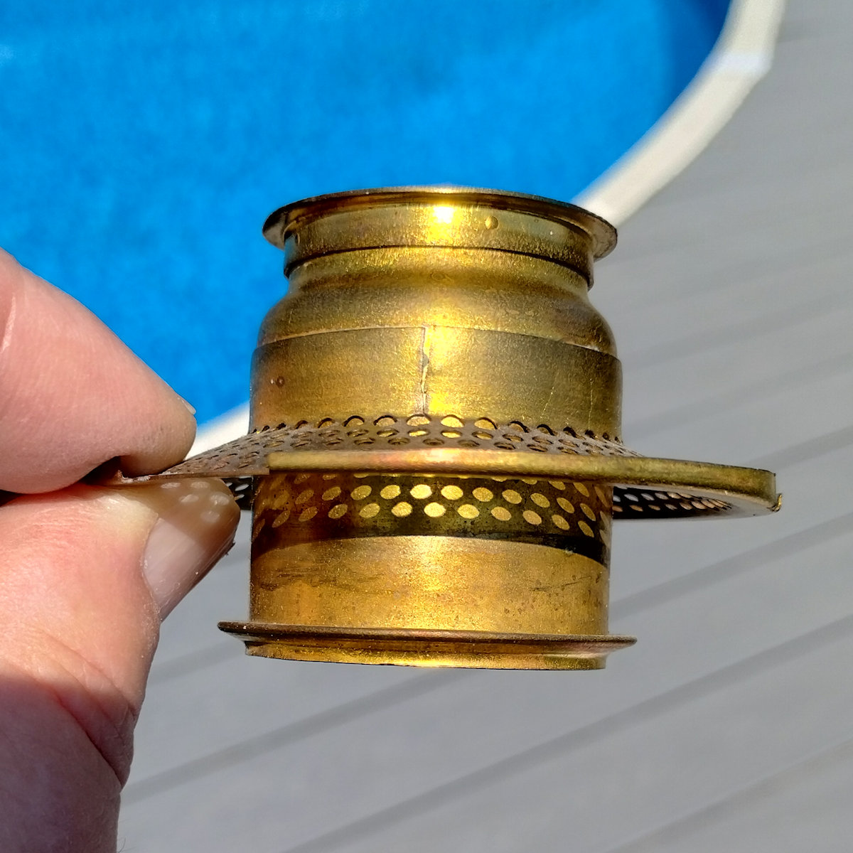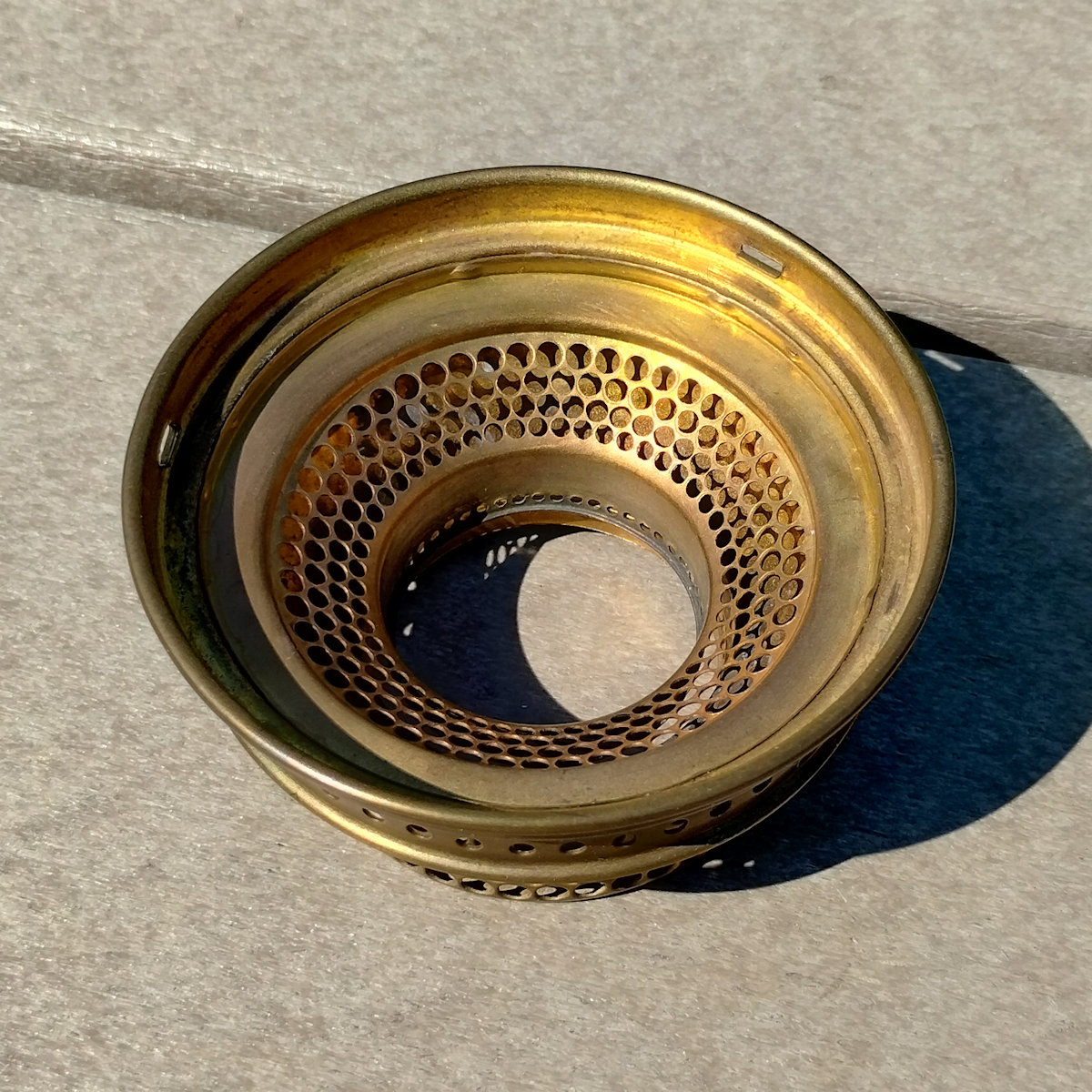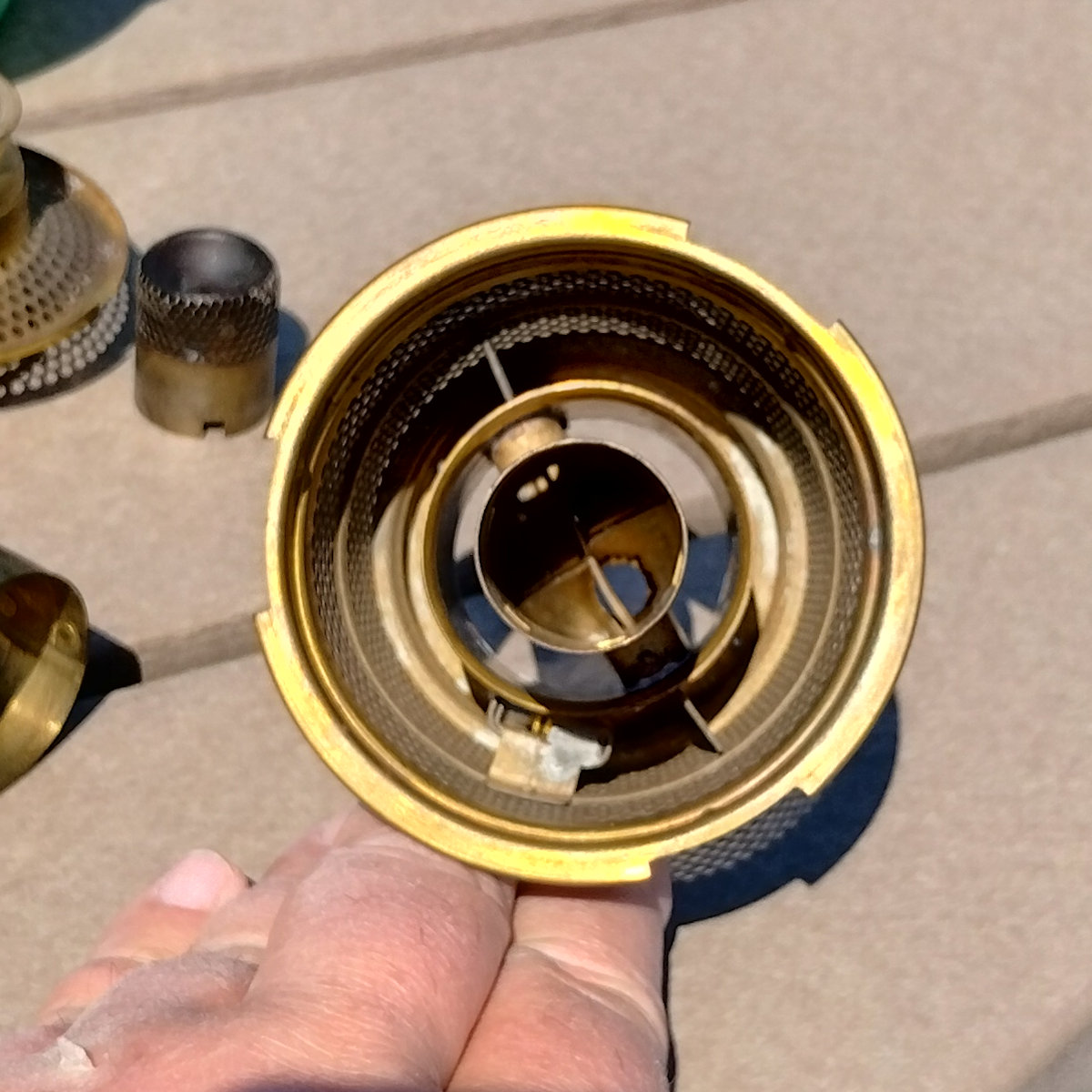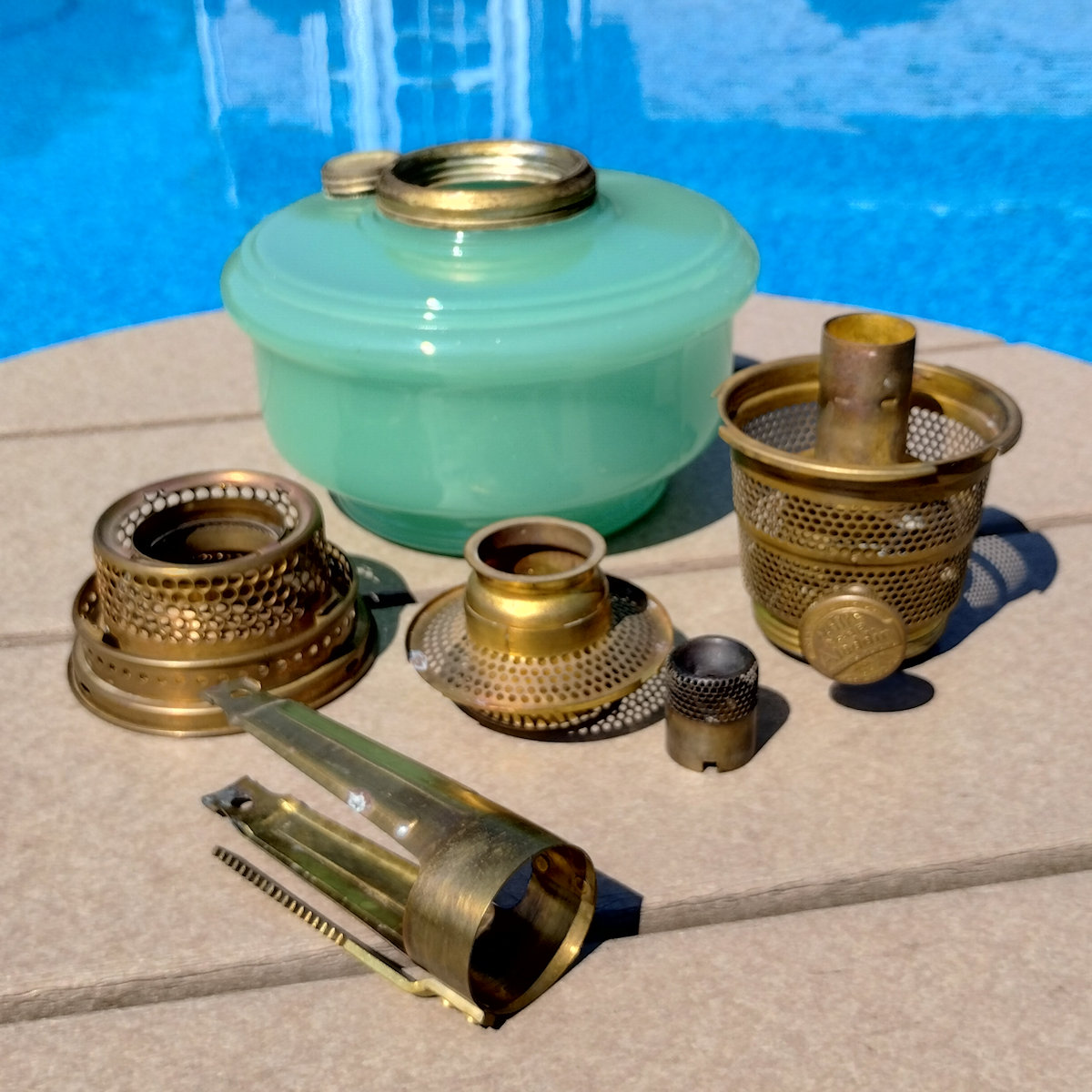 Aladdin Lamp Inside Chain Hanging Lamp with Parchement Shade. As you may know, the inside chaing hanging lamps can be a challenge to find. This lamp has the Green moonstone fount, with no chips or cracks. The burner is the correct Model B. This burner is complete except for a wick. The flame spreader is an old original with small dent in the perforated section. The outer wick tube has the ever present “B wick tube stress crack) See images. The bottom of the burner has hole drilled in it, but that can be easily corrected replacing the bottom center plate. The frame appears to have had some repainting done. The whipolite shade is an old original as is the heat bell (smoke bell)