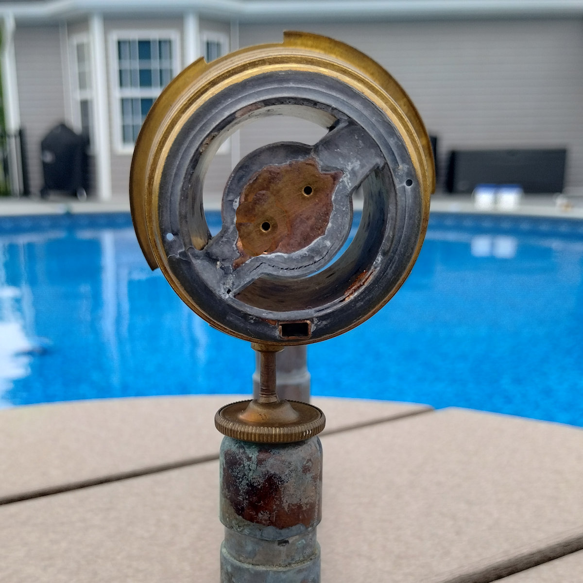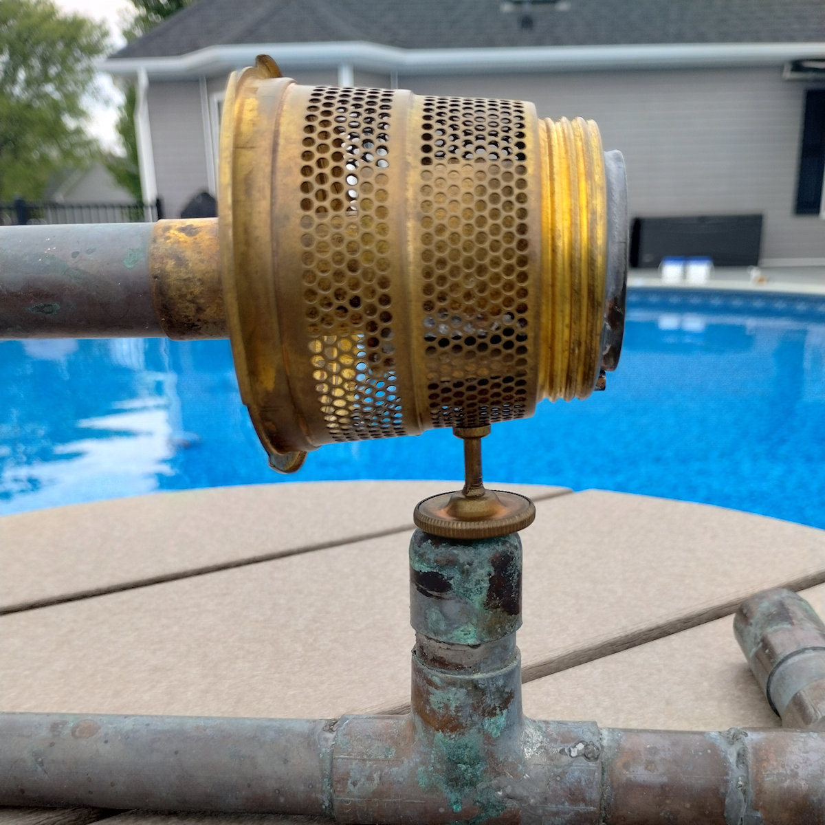I made this tool when I was doing a lot of restoration and repair work. This tool is designed specifically to hold a Model B Aladdin burner base, thru the center of the inner tube, while providing a rest for the burner knob. Why? Have you’ve ever found a Model B Burner with a knob that was either loose on the shaft, or bent? If you’ve ever tried to solder that knob back to where is should be, centered and true, you’ll understand why I built this benchtop tool.  By freeing up my hands, the tool allowed to me to control my heat source and solder for those perfect reattachments. It’s worth noting, I intentionally created an off-set in the tool, as the wick raiser knob shaft on Model B burners does not run down the centerline of the long axis of the burner. (see image)