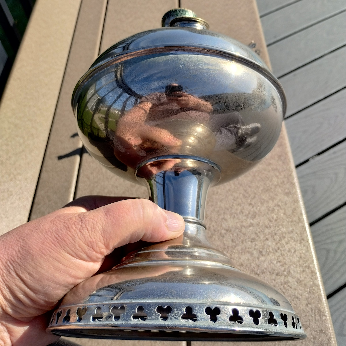 The KYSO #2 Oil Lamp was sold in Kentucky Standard Oil Stations during the 1920’s. Manufactured in the United States by Edward Miller & Company. This Lamp is complete and it has a much better than average nickel finish. No dents or cracks. It has a fresh wick too. These lamps are difficult to find. A ebay search for “Kyso Oil Lamp” produces few, if any results. If you enjoy Aladdin competitor lamps this is a good one to have.